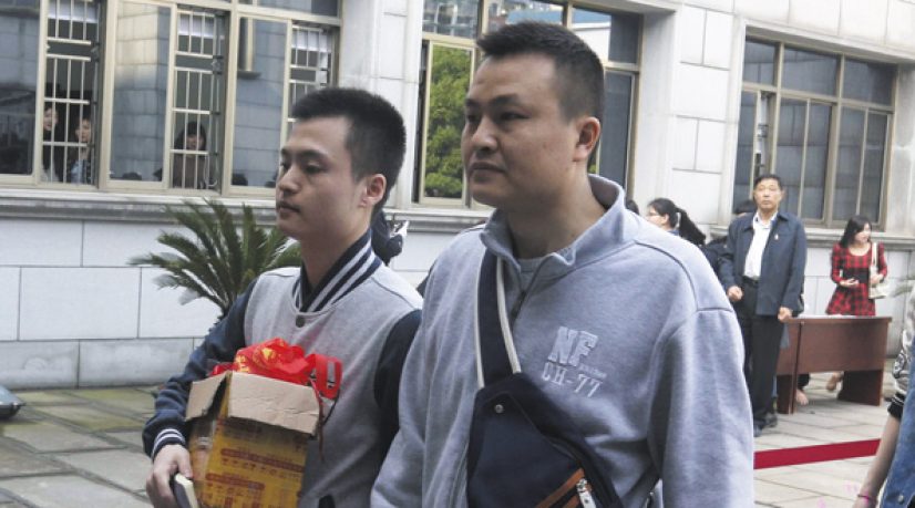 Sun Wenlin, à gauche et son partenaire Hu Mingliang arrivant au tribunal du quartier de Furong, pour soutenir le premier mariage gay en Chine.