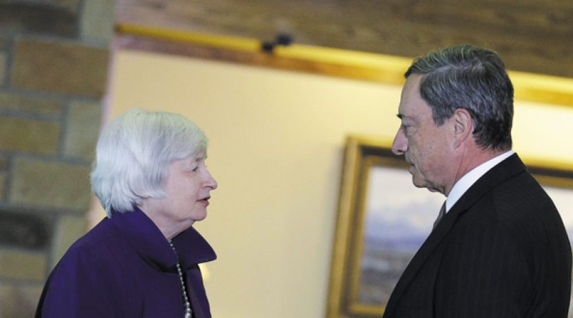 Janet Yellen, présidente du Conseil des gouverneurs de la Réserve fédérale des États-Unis et Mario Draghi, président de la Banque centrale européenne