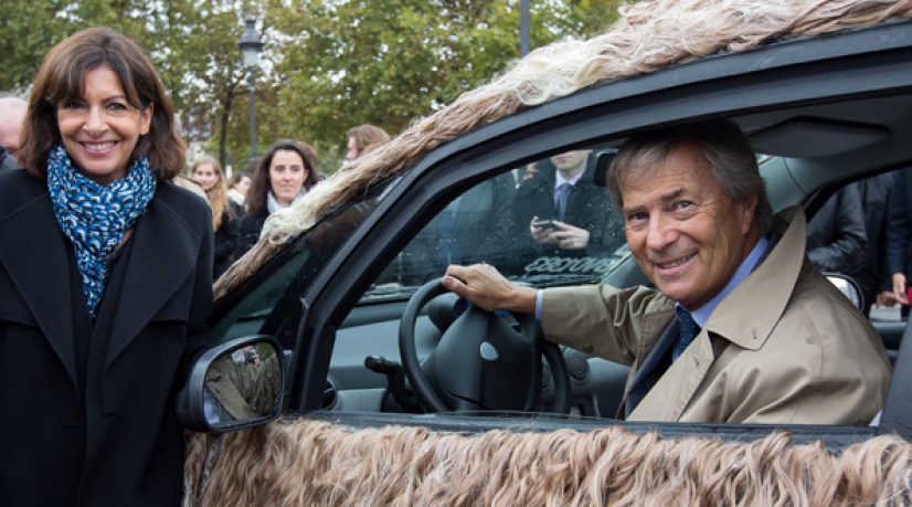 Vincent Bolloré, présentant un des neufs modèles d’Autolib ‘customisée’, l’“Auto Bonheur”.