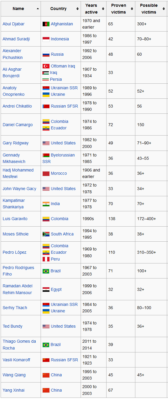 Pour mémoire voici une liste des principaux tueurs en série contemporain (Wikipédia US) :
